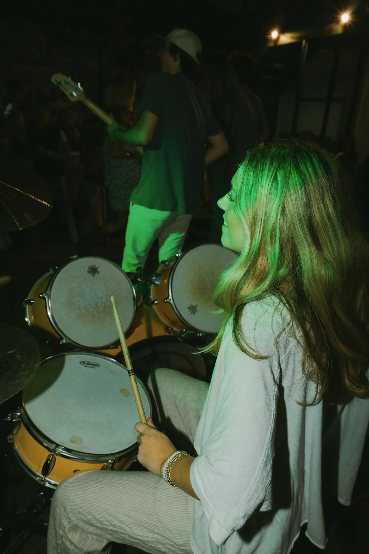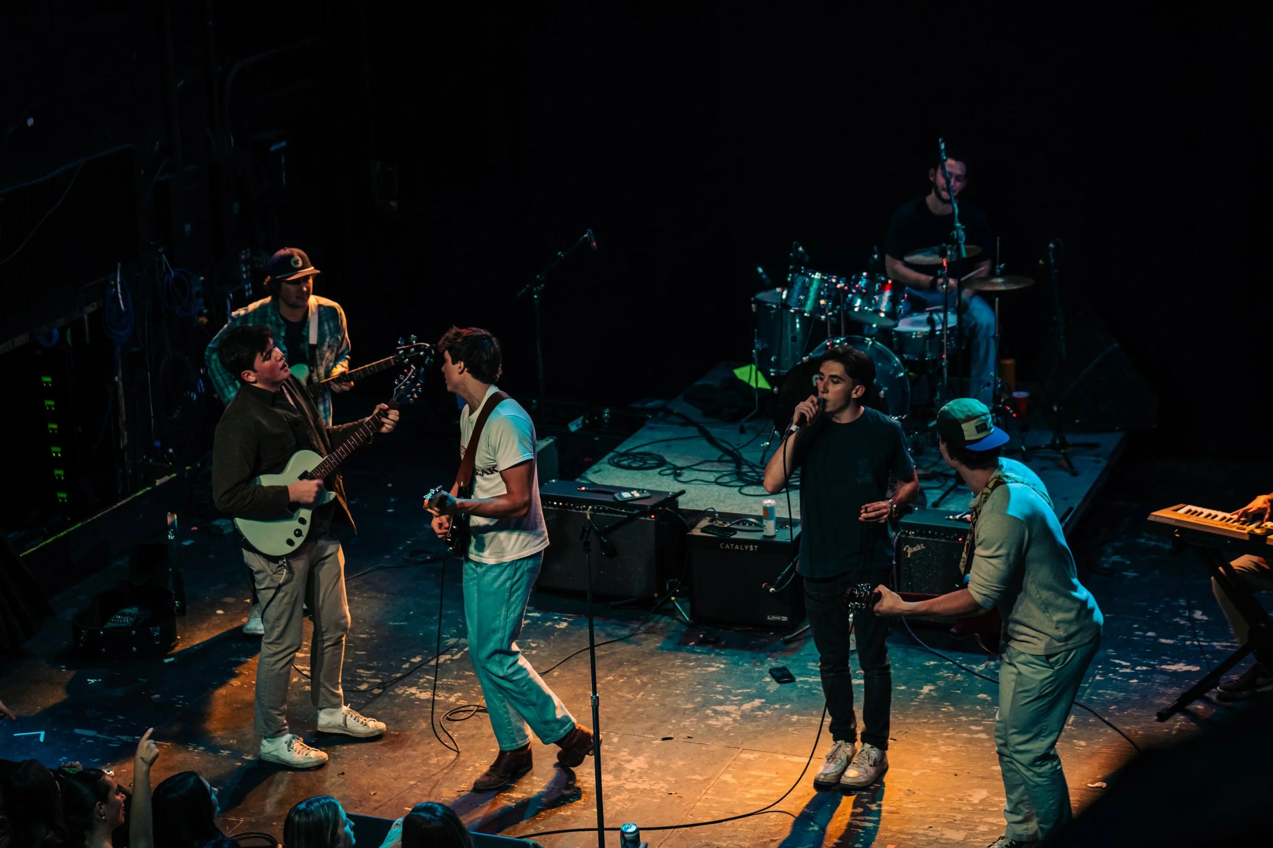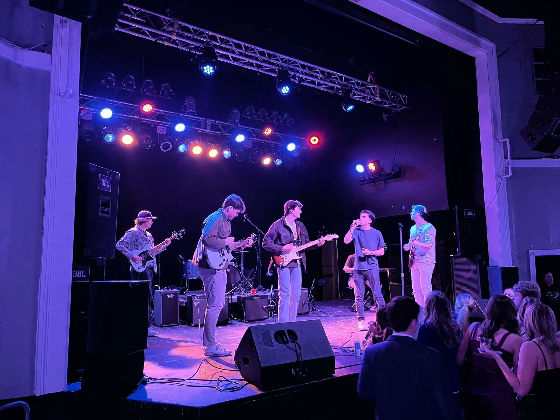 Young band performing on stage at a crowded indoor concert, with audience members dancing and watching.
