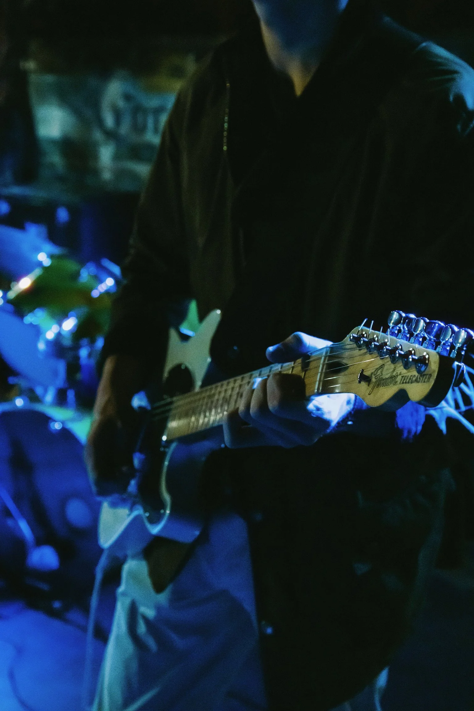Crowd of young people attending a concert or party in a dimly lit indoor venue with blue lighting, where a live band is performing on stage.