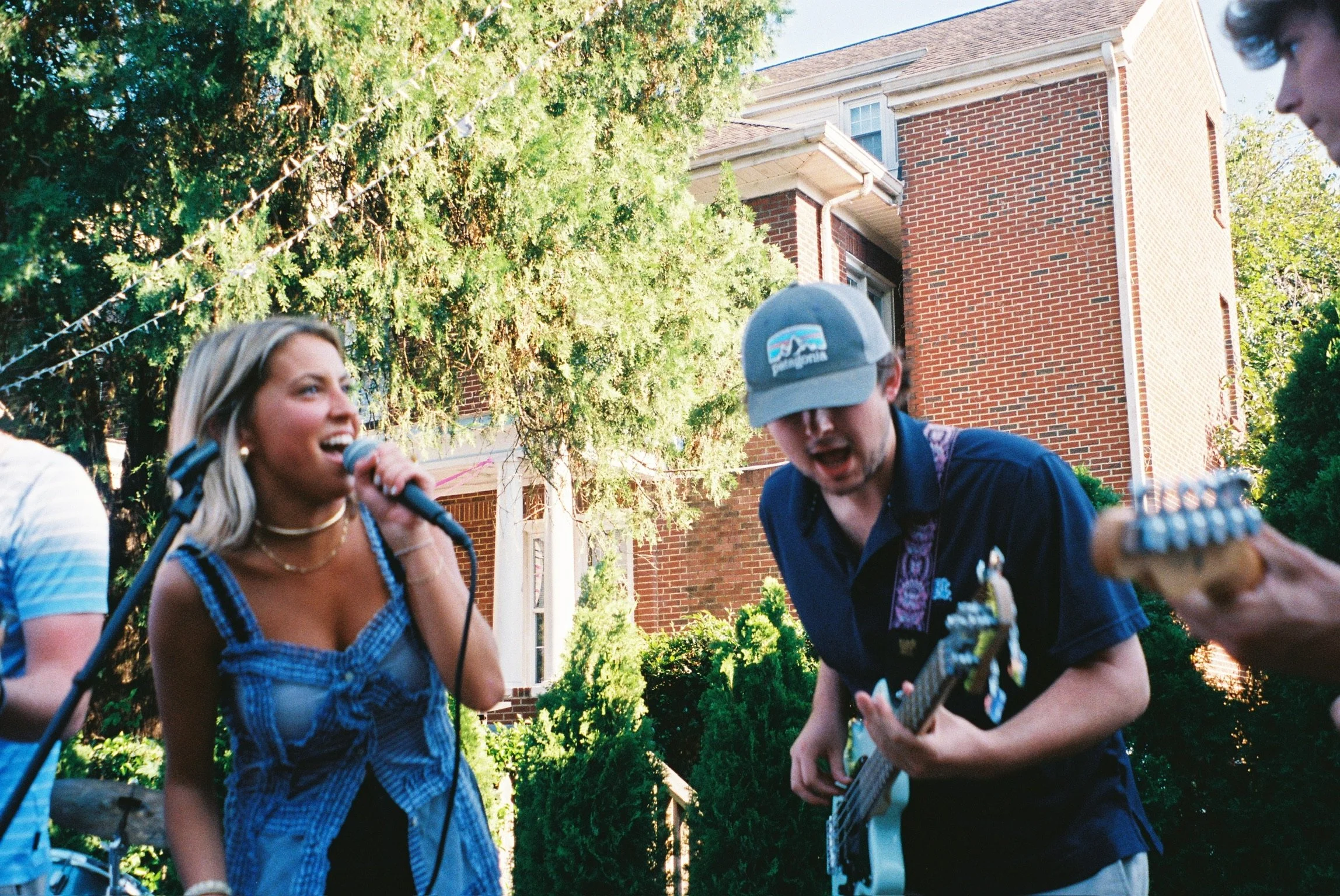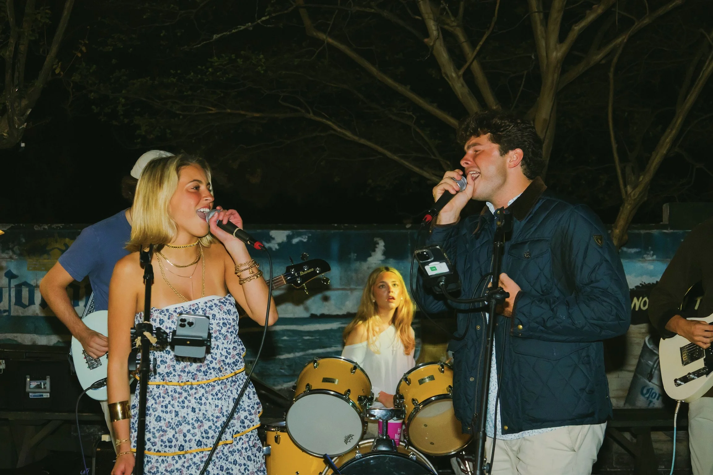 Young people performing music at a baseball-themed outdoor event, with a sign that reads "CHI OMEGA" and baseball-themed decorations.