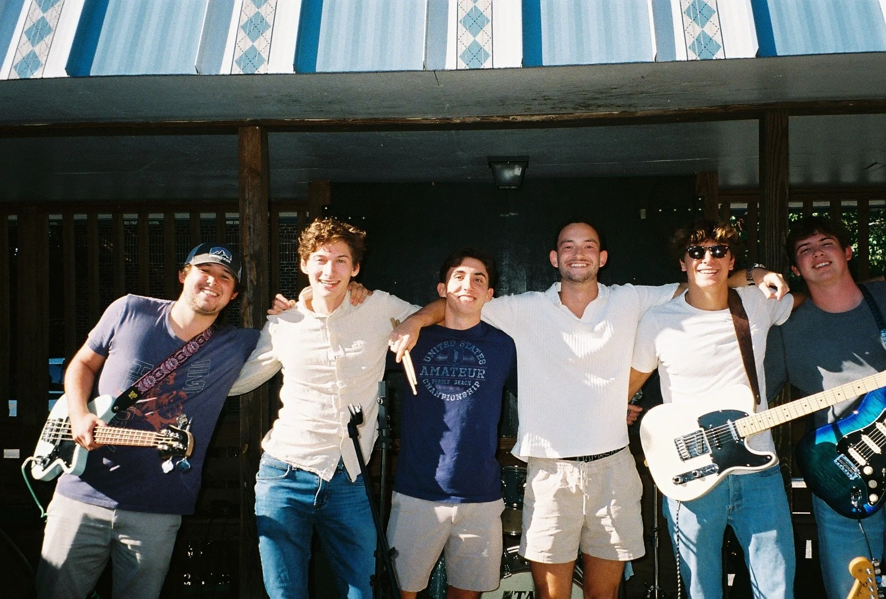 Group of young people in sports jerseys on stage decorated with blue and white balloons, with guitars and amplifiers in front, during a celebration outside a house.