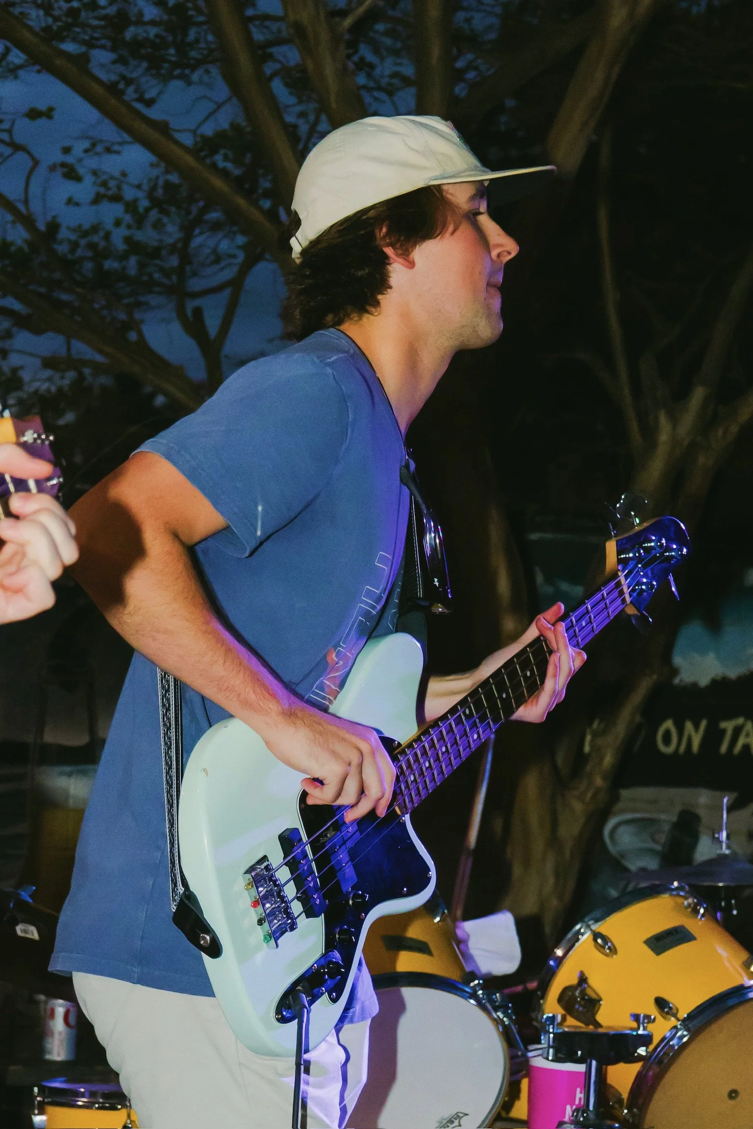 A nighttime outdoor concert with a crowd of people, some dancing and others watching. A guitarist stands on stage with string lights overhead, and trees are visible in the background.
